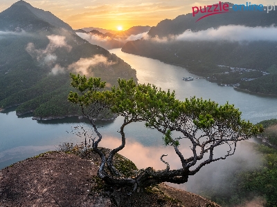 Skała, Góry, Sosna, Wschód słońca, Rzeka, Mgła