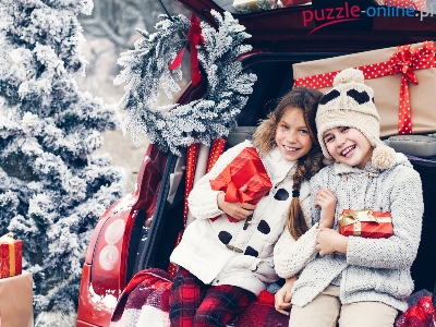 Śnieg, Samochód Dziecko, Dziewczynki, Choinki, Roześmiane, Zima, Radosne, Prezenty