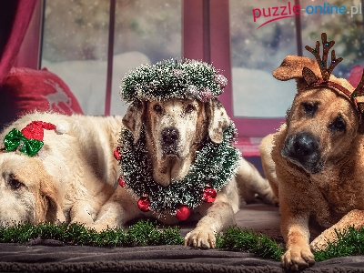 Świąteczne, Okno, Trzy, Psy, Ozdoby