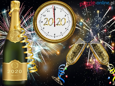 Sylwester, Zegar, Butelka, Fajerwerki, Grafika, Nowy Rok, Szampan