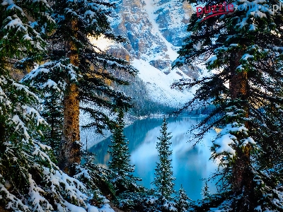 Prowincja Alberta, Góry, Zima, Jezioro Moraine, Kanada, Park Narodowy Banff, Drzewa