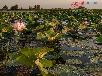 Puzzle Lotosy, Rzeka, Kwiaty, Listki