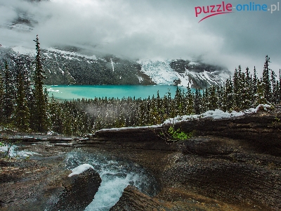 Canadian Rockies, Góry Skaliste, Strumyk, Mgła, Kanada, Skały, Jezioro Berg Lake, Drzewa, Kolumbia Brytyjska