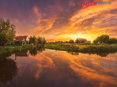 Domy, Skansen Zaanse Schans, Drzewa, Zaandam, Wschód słońca, Most, Wiatraki, Holandia, Skansen Wiatraków, Rzeka Zaan