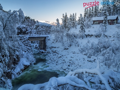 Most, Drzewa, Zima, Rzeka, Dom