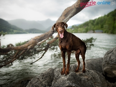 Doberman, Krajobraz, Góry, Konar, Pies, Kamienie, Woda
