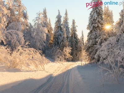 Śnieg, Drzewa, Ślady, Droga, Zima, Promienie słońca, Świerki