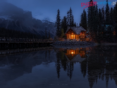 Dom, Jezioro Emerald Lake, Las, Drzewa, Kanada, Góry, Park Narodowy Yoho, Most, Prowincja Kolumbia Brytyjska