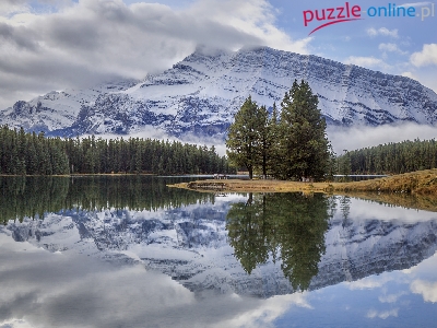 Góra Mount Rundle, Drzewa, Alberta, Two Jack Lake, Kanada, Odbicie, Góry, Jezioro, Las, Park Narodowy Banff