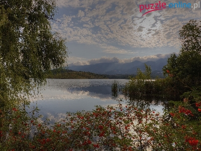 Kwiaty, Drzewa, Góry, Jezioro, Krzewy, Chmury