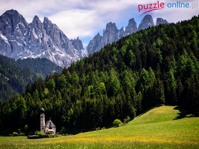 Las, Góry Dolomity, Włochy, Masyw Odle, Kościół św. Jana, Dolina Val di Funes, Chmury