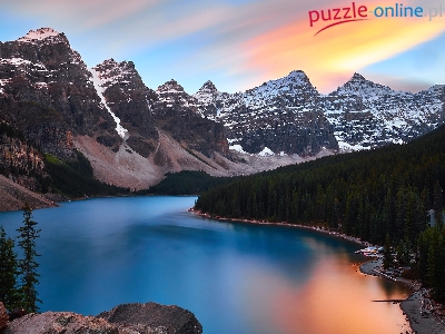 Moraine Lake, Kanada, Park Narodowy Banff, Góry, Drzewa, Jezioro, Lasy, Prowincja Alberta