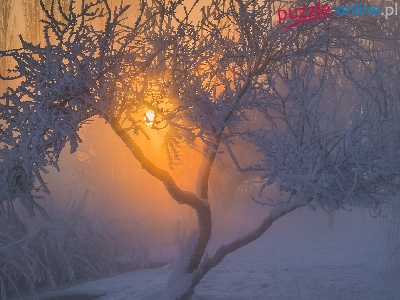 Drzewa, Krzewy, Mgła, Drzewo, Zima, Ośnieżone, Wschód słońca
