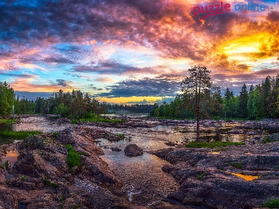 Kiiminki, Teren Koiteli, Chmury, Las, Kamienie, Wschód słońca, Rzeka Kiiminkijoki, Finlandia, Drzewa