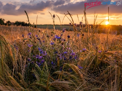 Kwiaty, Zachód słońca, Zboże, Kłosy, Chabry