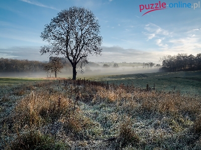 Mgła, Drzewo, Trawa, Poranek, Łąki, Oszroniona