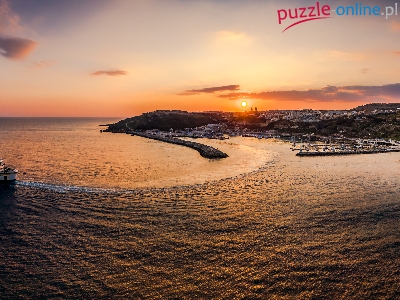 Mgarr, Zachód słońca, Malta, Morze, Statek, Wyspa Gozo