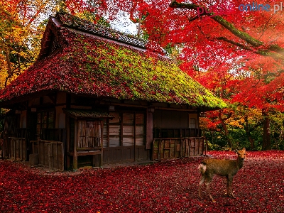 Drzewa, Sarna, Dom, Jesień, Słońce