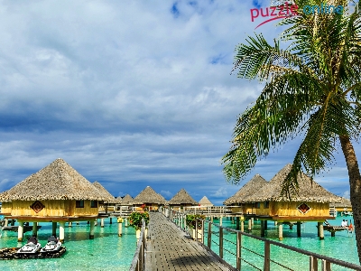 Ocean, Bora Bora, Łódki, Palma, Wakacje, Most, Polinezja Francuska, Domy, Tropiki