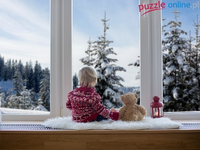 Okno, Åšnieg, Lampion, Dziecko, MiÅ›, Zima, Pluszowy, Drzewa