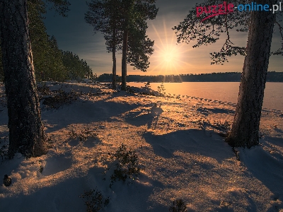Drzewa, Promienie słońca, Norwegia, Śnieg, Zima, Jezioro, Ringerike