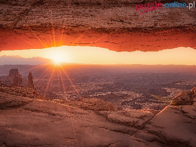 Łuk Mesa Arch, Stan Utah, Promienie słońca, Stany Zjednoczone, Park Narodowy Canyonlands, Skały