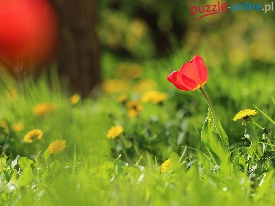 Mniszki, Rośliny, Czerwony, Tulipan, Trawa