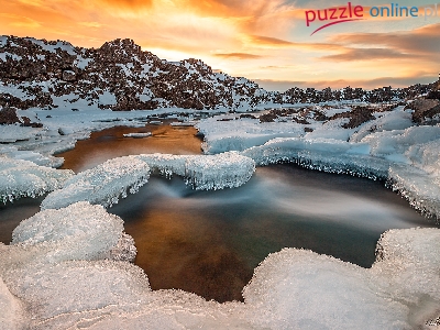 Zima, Park Narodowy Pingvellir, Islandia, Góry, Wschód słońca, Śnieg, Rzeka Oxara