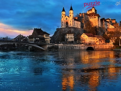 Szwajcaria, Rzeka Aare, Aarburg, Domy, Most