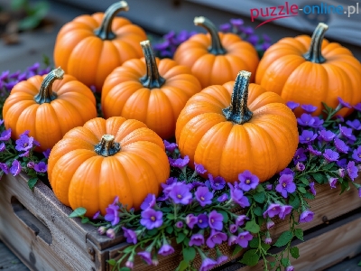 Skrzynia, Dynie, Petunie, AI, Fioletowe, Kwiaty, Drewniana