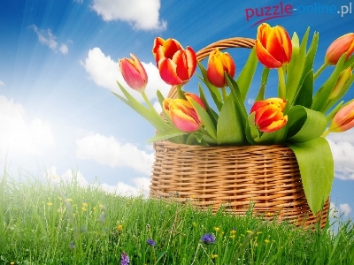 Łąka, Tulipanów, Słońca, Bukiet, Koszyk, Promienie
