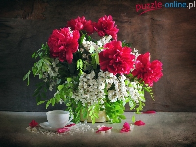 Puzzle Akacja, Bukiet, Piwonie, Filiżanka