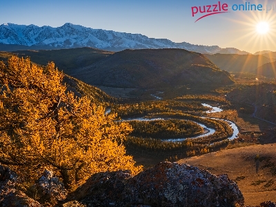 Drzewa, Ałtaj, Góry, Rzeka, Jesień, Republika Ałtaju, Rosja, Las, Promienie słońca