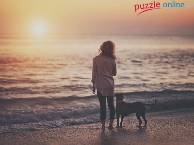 Amstaff, Słońca, Kobieta, Morze, Zachód