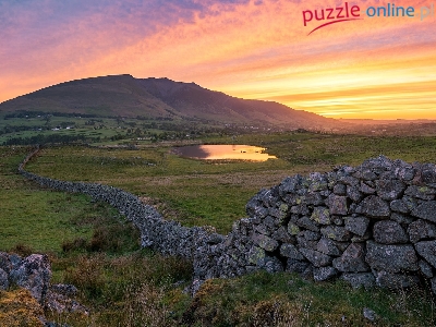 Zachód słońca, Góry, Park Narodowy Lake District, Anglia, Kamienny, Góra, Jezioro, Murek, Drzewa, Tewet Tarn