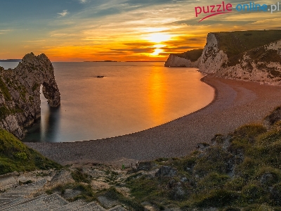 Plaża, Hrabstwo Dorset, Anglia, Wybrzeże Jurajskie, Skały, Durdle Door, Zachód słońca, Morze, Łuk