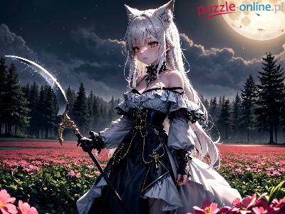 Pole, Dziewczyna, Kwiaty, Anime, Sukienka, Broń, Księżyc