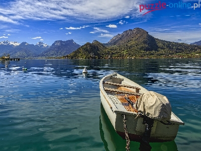 Łódka, Góry, Domy, Francja, Jezioro Annecy, Alpy, Annecy