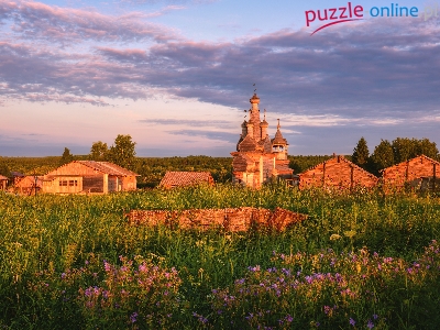 Łąka, Rosja, Kwiaty, Trawa, Cerkiew, Wieś, Drzewa, Domy, Obwód archangielski, Kimzha, Chmury
