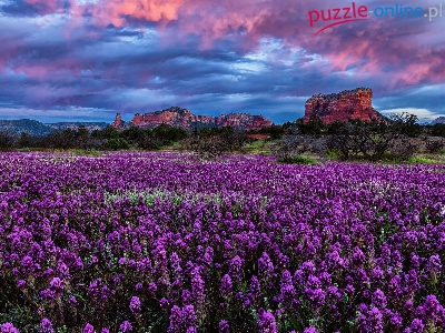 Castilleja exserta, Skały, Góry, Łąka, Drzewa, Arizona, Stany Zjednoczone, Kwiaty, Chmury