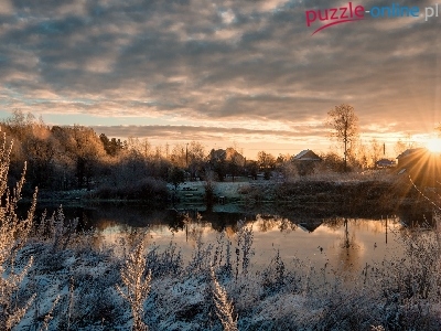 Rzeka Dubna, Łatgalia, Wschód słońca, Domy, Szron, Świt, Łotwa, Wieś, Drzewa