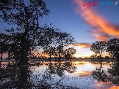Odbicie, Australia, Słońca, Coonawarra, Drzewa, Staw, Zachód