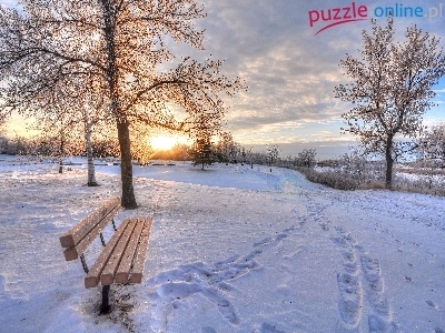 Ławka, Chmury, Zima, Wschód słońca, Drzewa