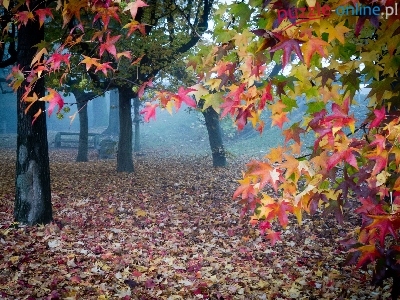 Ławka, Drzewa, Jesień, Park, Liście, Mgła