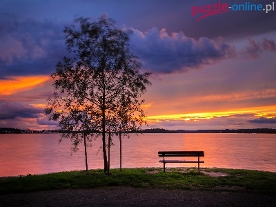 Ławka, Piękny, Słońca, Horyzont, Drzewo, Jezioro, Zachód