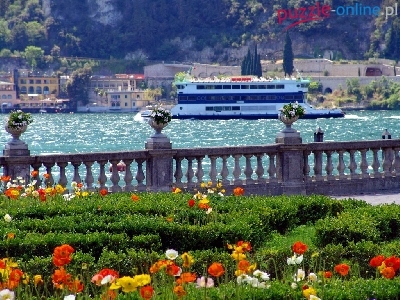 Puzzle Balustrada, Klomb, Kwiaty, Rzeka