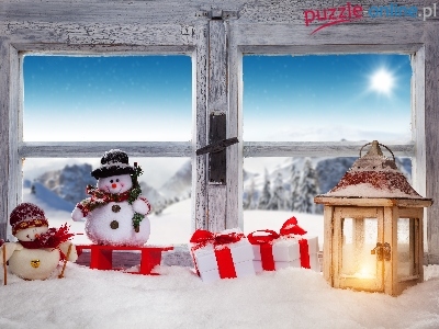 Okno, Lampion, Świeca, Bałwanki, Kompozycja, Parapet, Prezenty