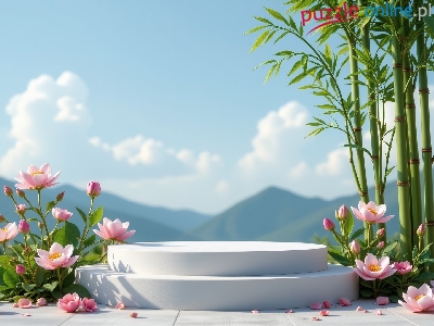 Lotosy, Drzewo, Podium, Bambus, Góry, Kwiaty