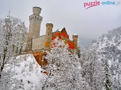 Skały, Bawaria, Zima, Niemcy, Zamek Neuschwanstein, Drzewa