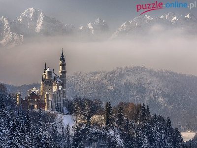 Zima, Bawaria, Drzewa, Niemcy, Zamek Neuschwanstein, Góry
